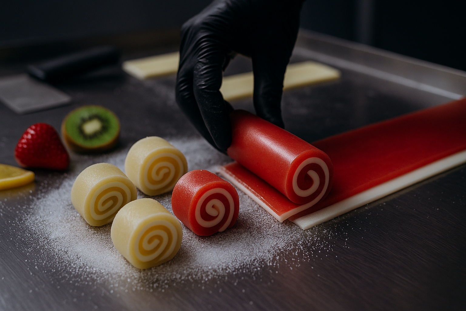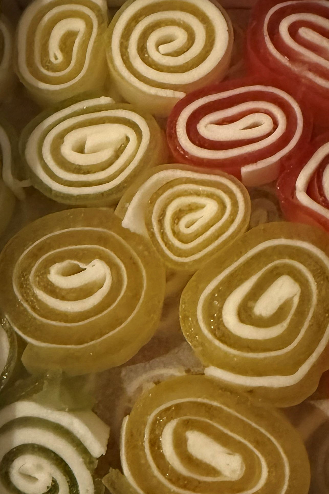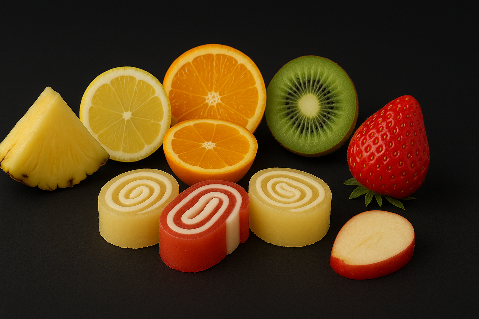Vaisių sulčių marmeladiniai suktinukai – tai rankų darbo saldainiai, sukurti iš natūralių vaisių sulčių ir tyrės, pasižymintys ryškiu skoniu bei dailiu, spiraliniu dizainu. Kiekvienas suktinukas savyje jungia kelis skonius – ananaso, apelsino, citrinos, obuolio, kivio ir braškės – kurie harmoningai dera tarpusavyje, suteikdami gaivų ir saldų poskonį.