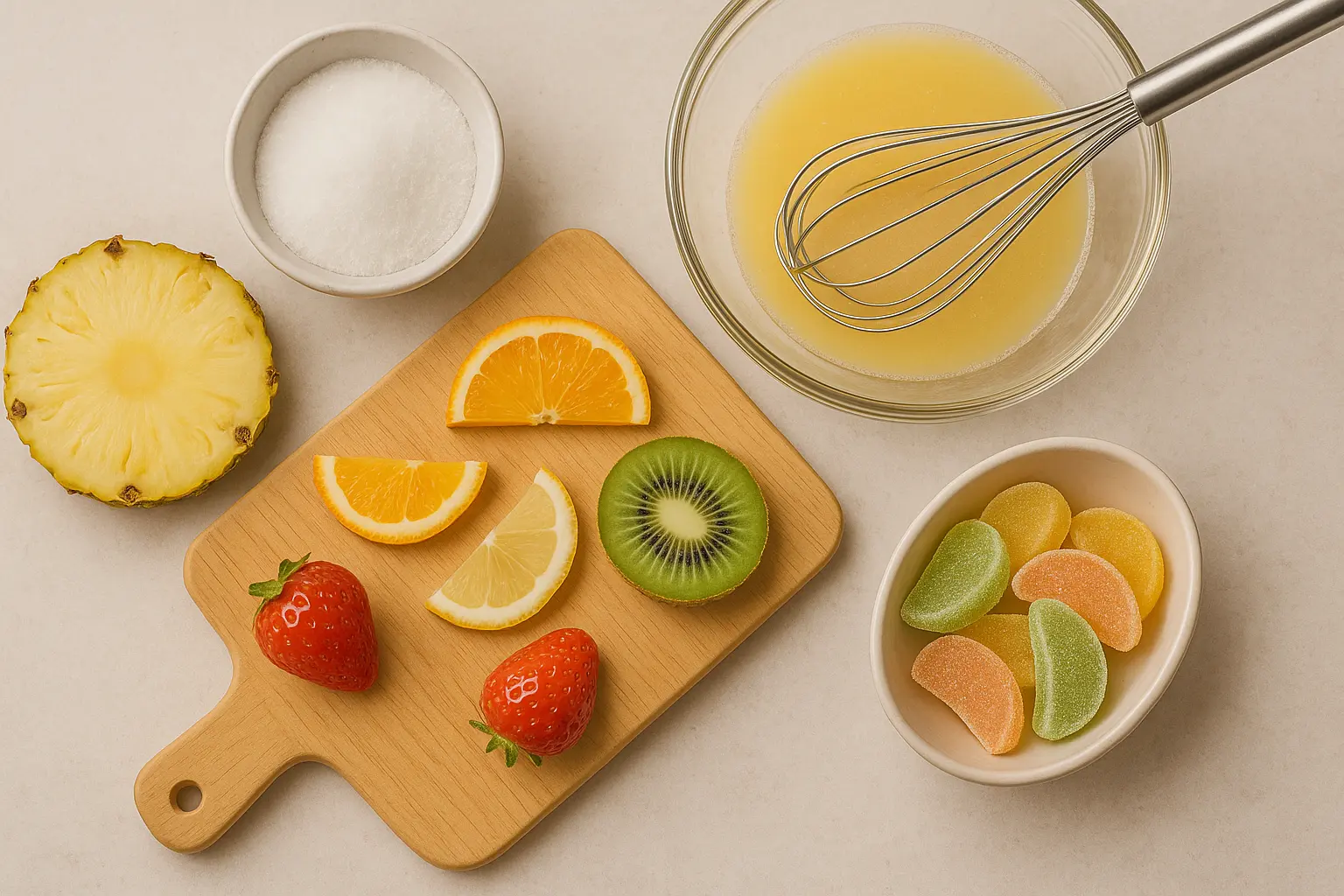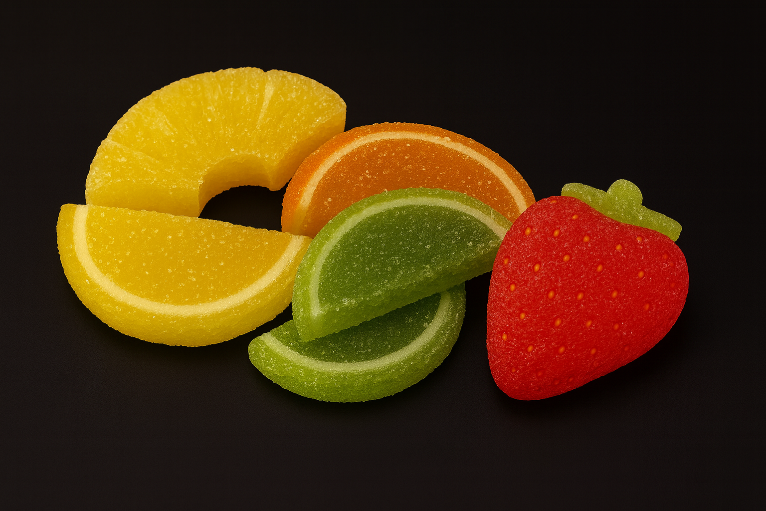 Vaisiniai marmeladiniai saldainiai – tai spalvingi, cukrumi pabarstyti pusmėnulio formos saldainiai, pagaminti iš natūralių vaisių sulčių ir tyrių. Kiekvienas skonis primena vasarą – ananasas suteikia tropinio gaivumo, apelsinas ir citrina – malonios rūgštelės, kivi – švelnaus egzotiškumo, o braškė – saldžios vasaros aromato.